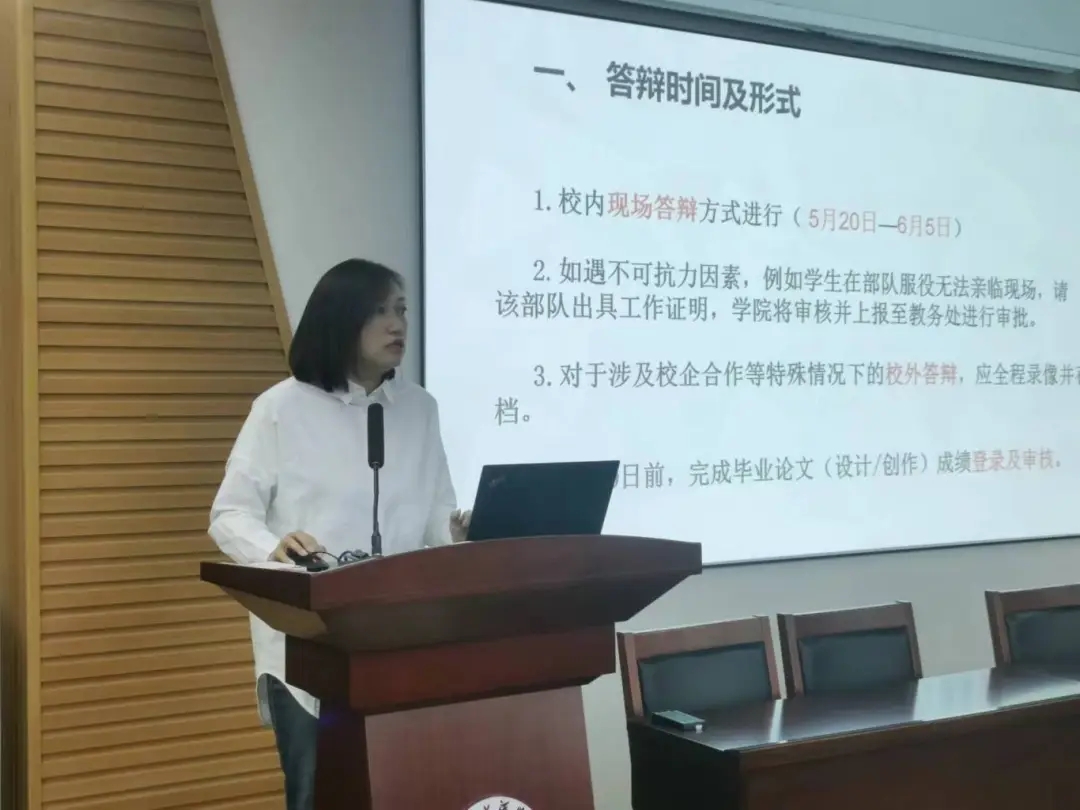 教务处副处长刘柳布置了2024届毕业论文(设计/创作)答辩工作,通报了2024届毕业生考研情况。各教学院毕业论文(设计/创作)领导小组应严格遵循《毕业论文(设计/创作)管理办法》的要求,确保评审和答辩的公正性和客观性,确保毕业论文(设计/创作)工作的高质量完成。截至目前,我校2024届毕业生中已有93人成功考取硕士研究生,其中包括3名被国外院校录取的学生和11名进入国内“双一流”院校的学生。